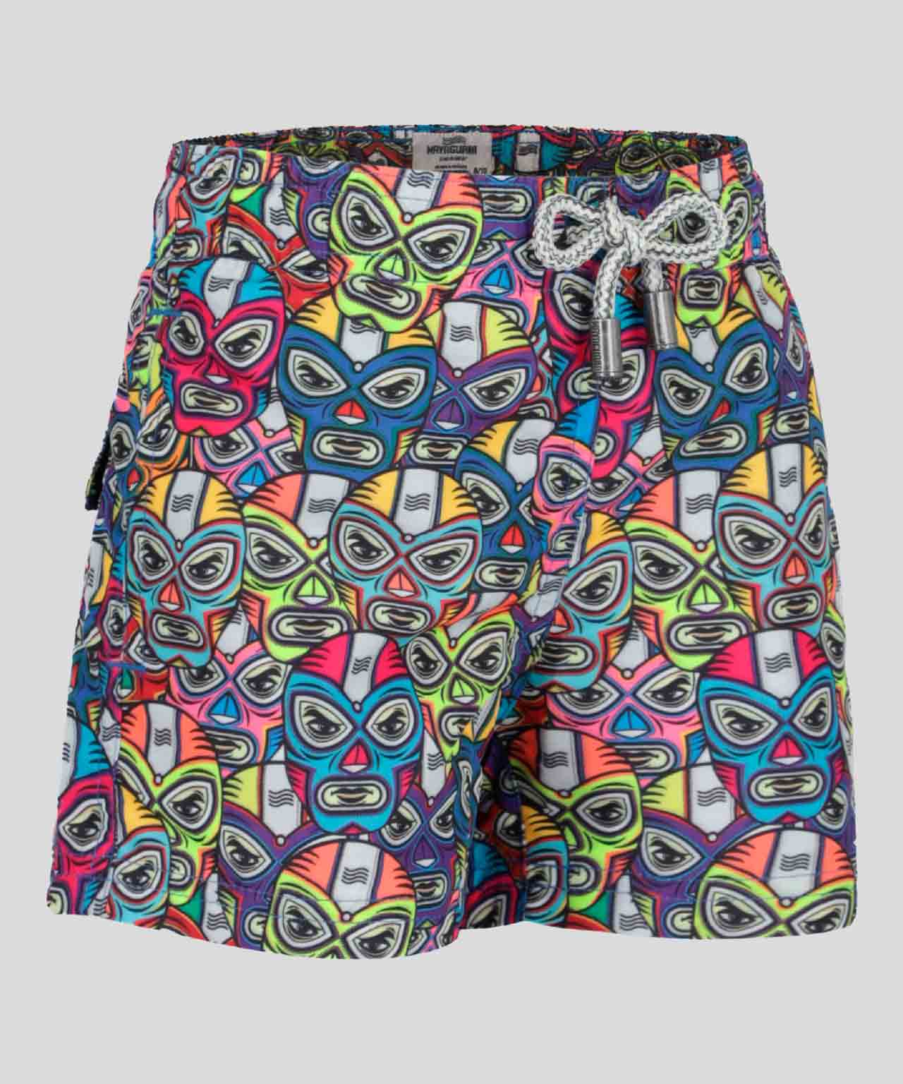 Patterned with colorful masks.